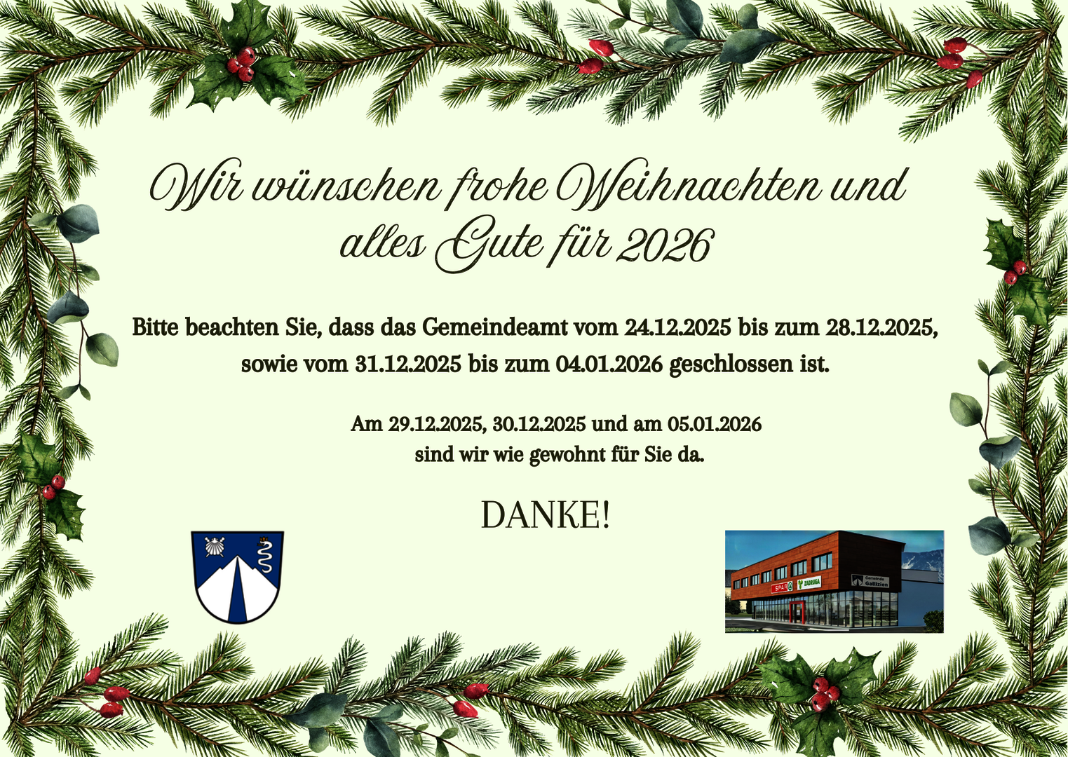 Bitte beachten Sie, dass das Gemeindeamt vom 24.12.2025 bis zum 28.12.2025, sowie vom 31.12.2025 bis zum 04.01.2026 geschlossen ist.